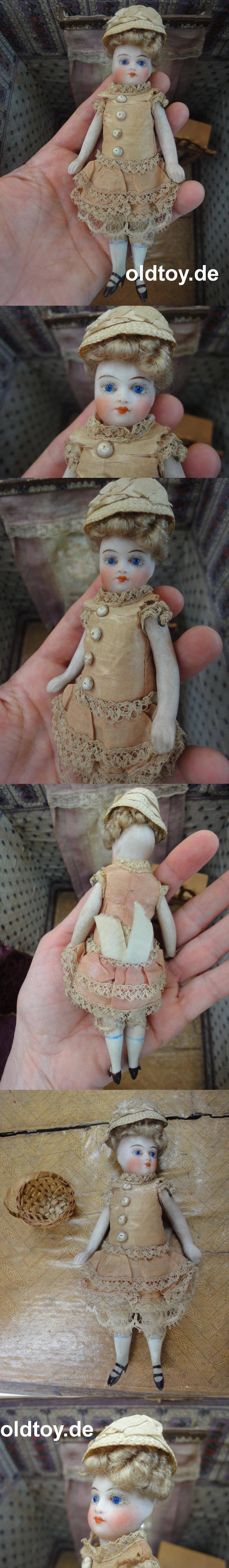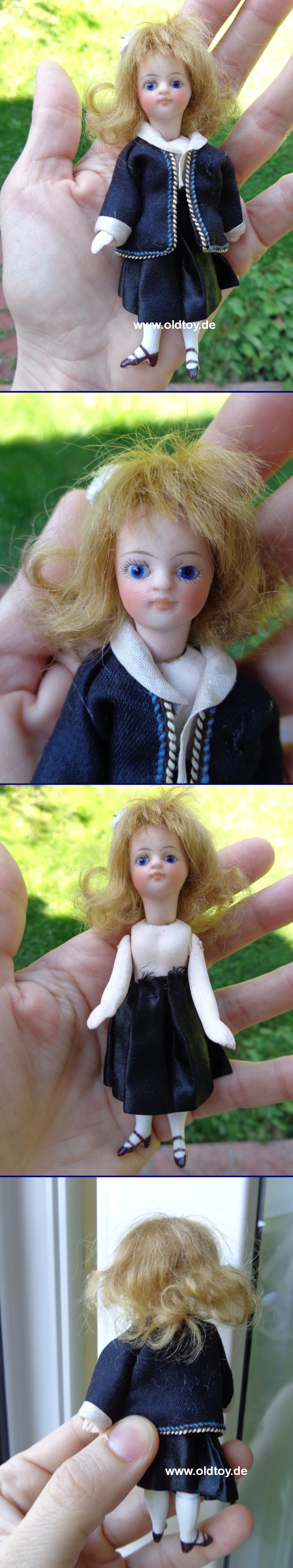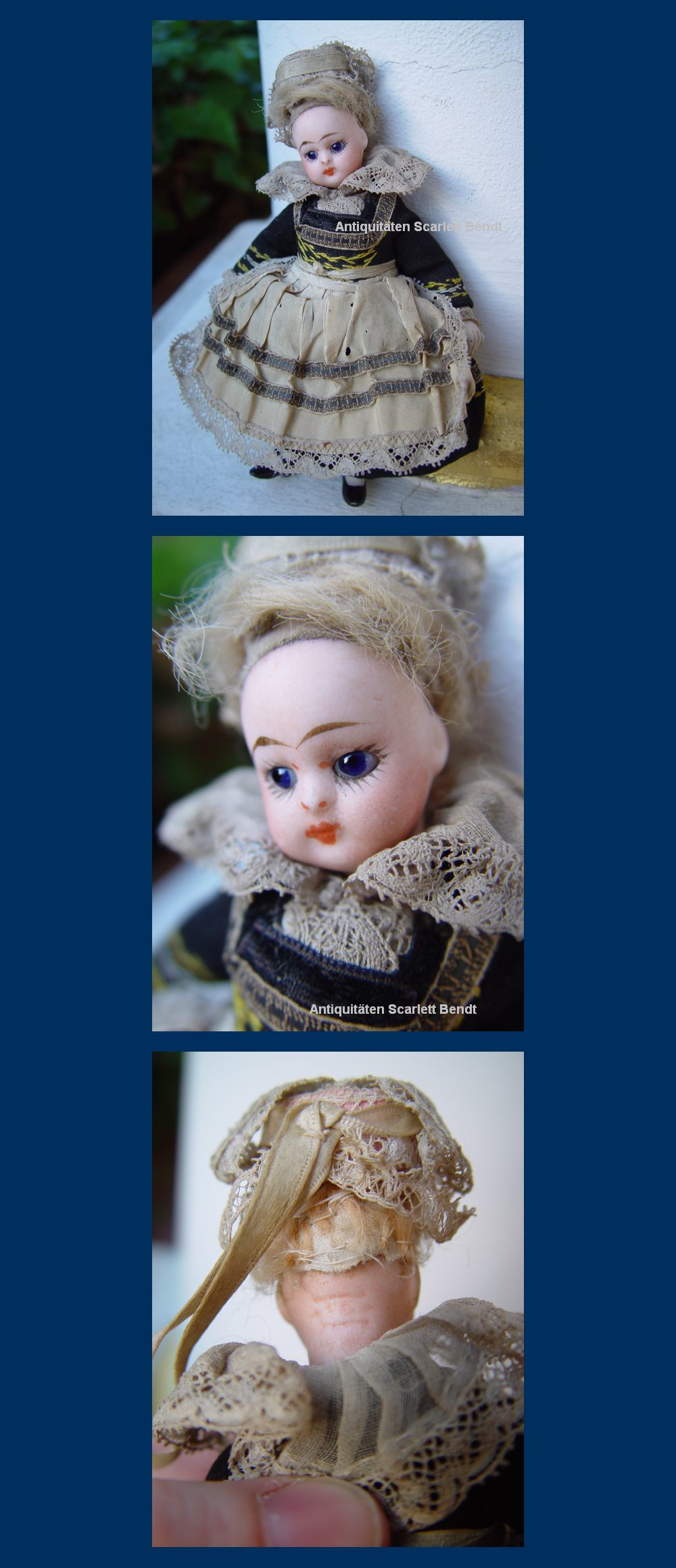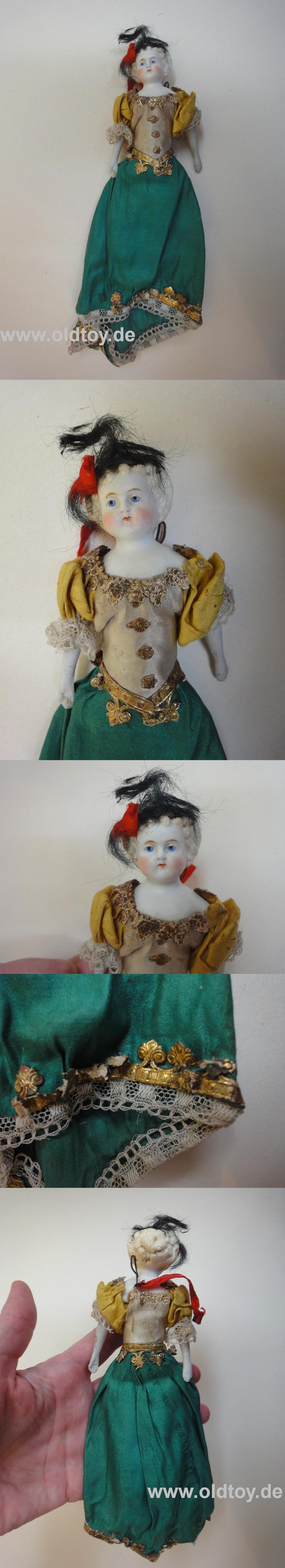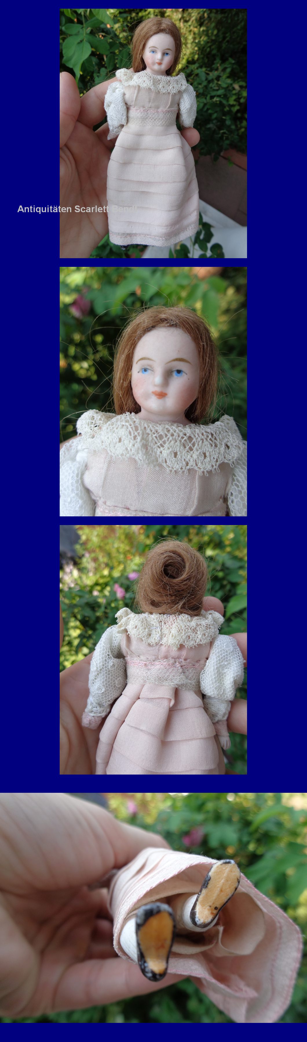 Altersbedingter, guter Zustand, leicht bespielt, mit Altersspuren. Die alte Kleidung ist, wie so oft bei kleinen Puppen, festgenäht. Puppenkopf ohne Haar-Riss, Hände, Beine & Schuhe ohne Abplatzer, ohne geklebte Stellen. Die feine Gesichtsbemalung ist gut erhalten, nicht berieben. Die Schuhe sind aus Biskuitporzellan, die Schuhspitzen und Absätze sind nicht bestoßen, nicht geklebt. Die Hände haben alle Finger, sie sind nicht bestoßen. Die schöne, alte Bekleidung ist in gutem Zustand, mit Altersspuren, ohne Mottenlöcher, mit wenigen kleinen Altersfleckchen. Stubenpuppe ohne Gerüche, aus Nichtraucherhaushalt.