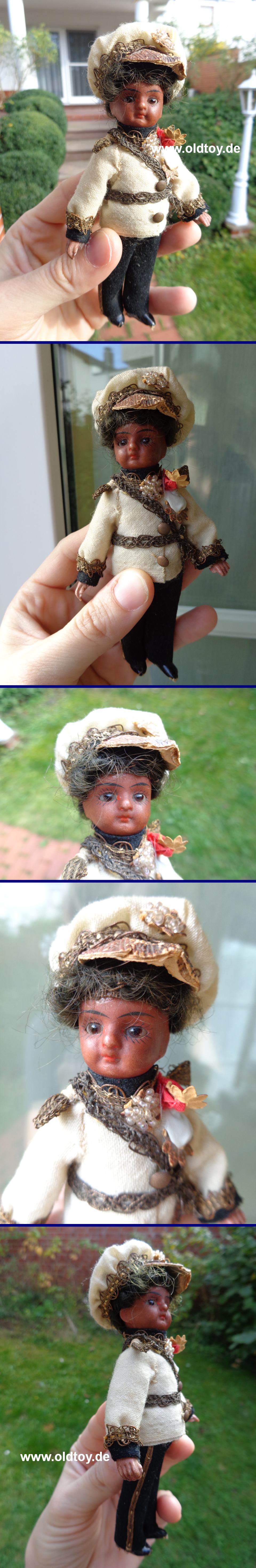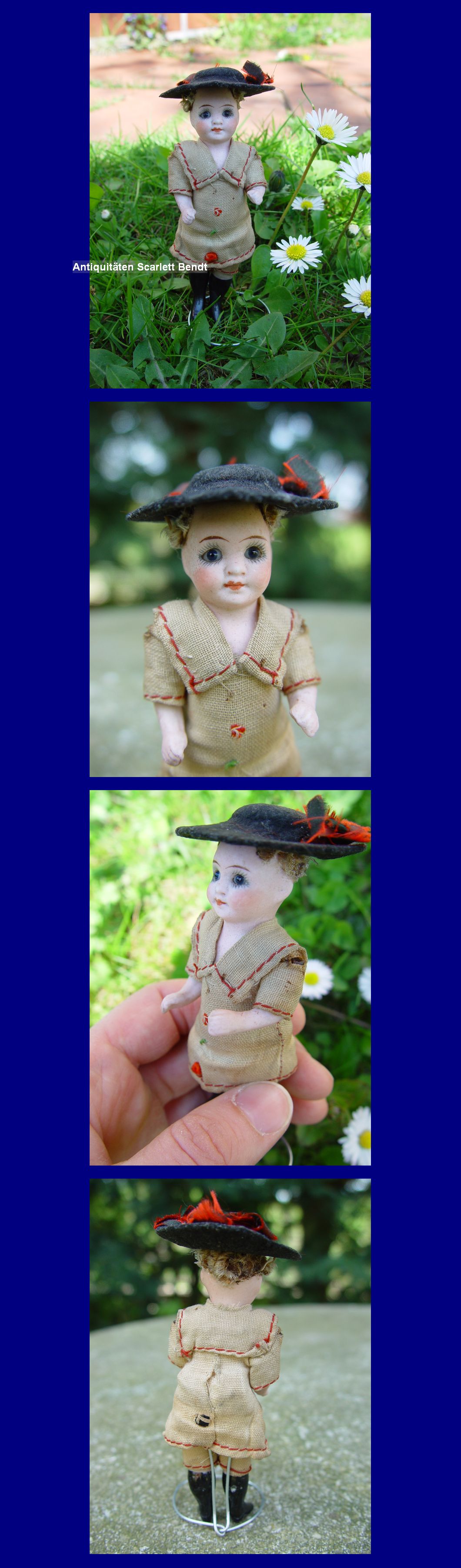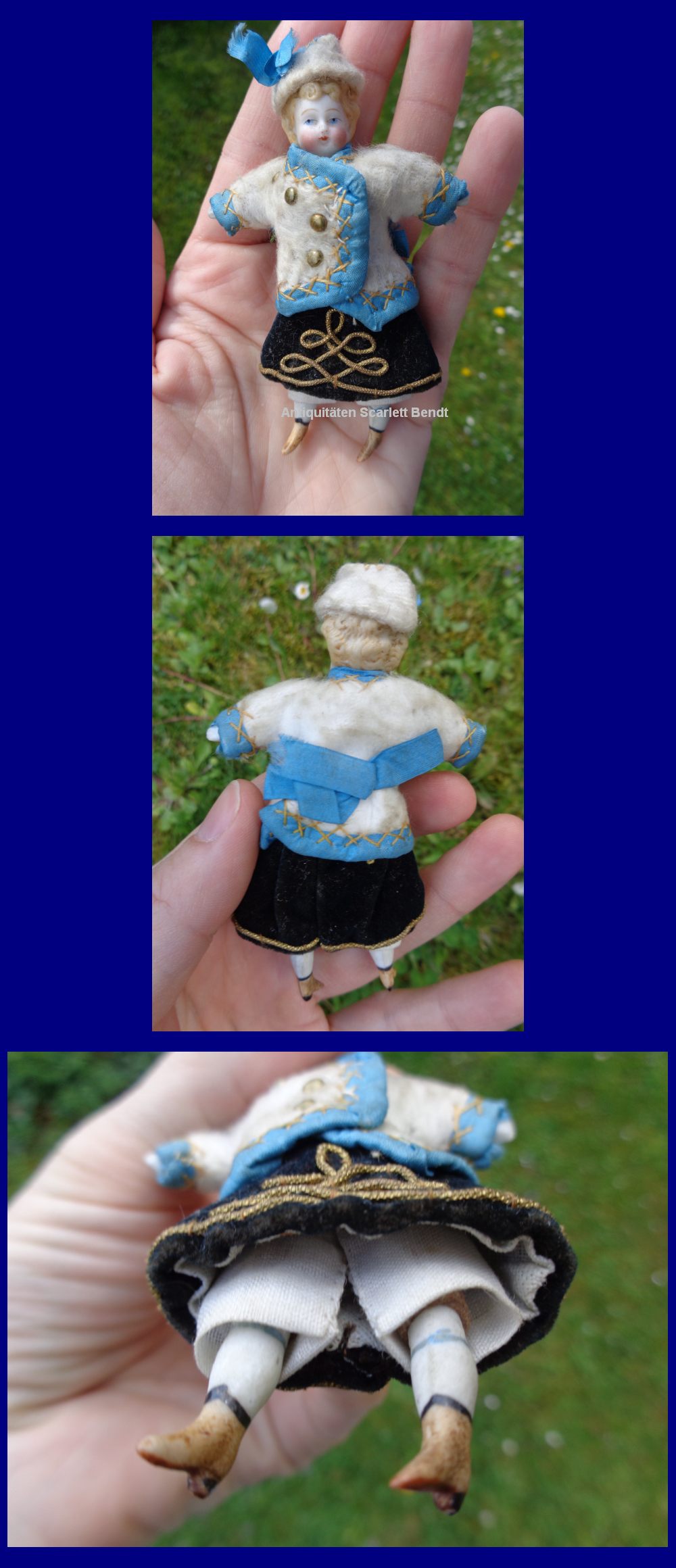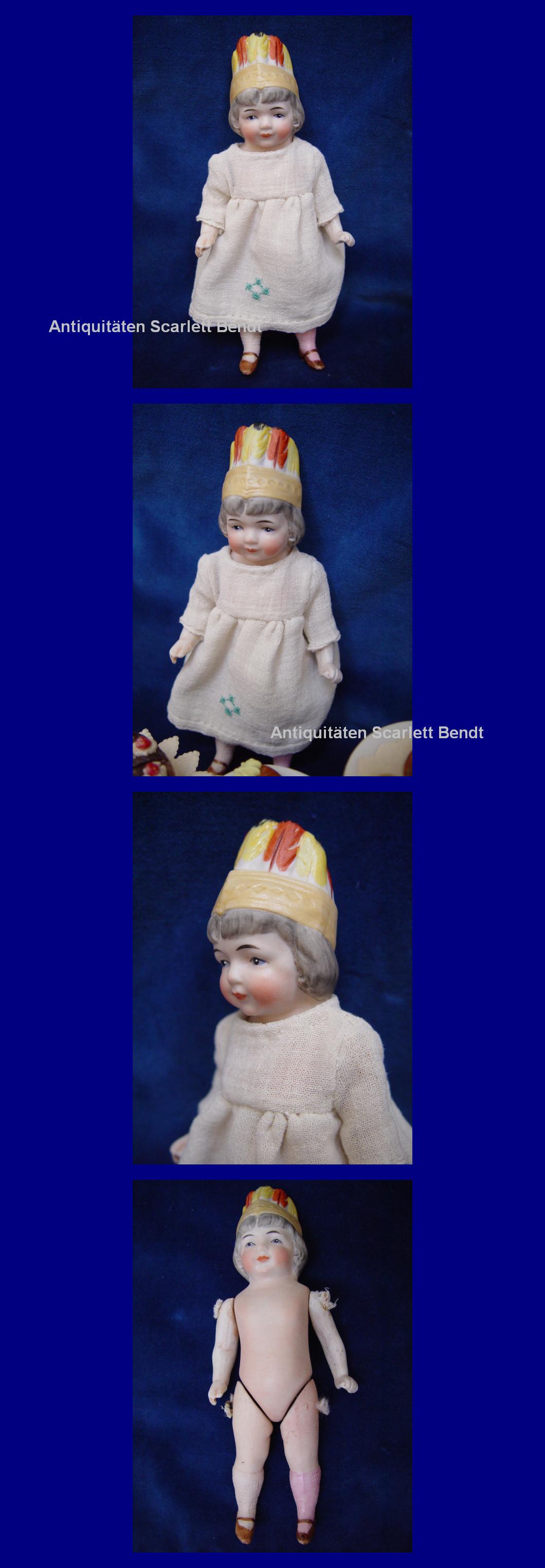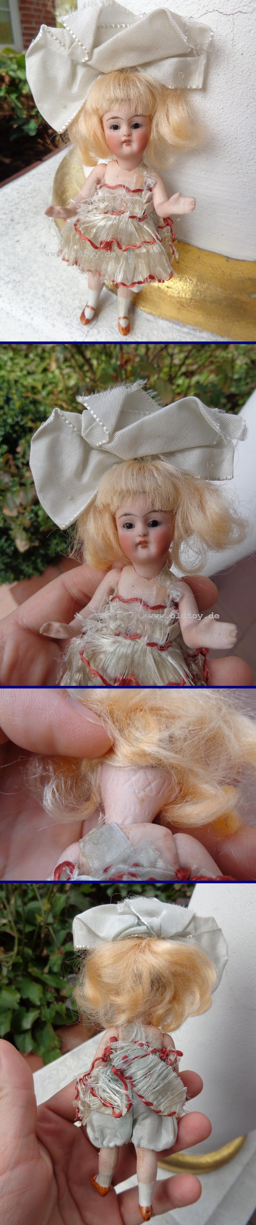 Altersbedingter, guter Zustand, leicht bespielt, mit Altersspuren. Die alte Kleidung ist, wie so oft bei kleinen Puppen, festgenäht. Puppenkopf ohne Haar-Riss, Hände, Beine & Schuhe ohne Abplatzer, ohne geklebte Stellen. Die feine Gesichtsbemalung ist gut erhalten, nicht berieben. Die Schuhe sind aus Biskuitporzellan, die Schuhspitzen und Absätze sind nicht bestoßen, nicht geklebt. Die Hände haben alle Finger, sie sind nicht bestoßen. Die schöne, alte Bekleidung ist in gutem Zustand, mit Altersspuren, ohne Mottenlöcher, mit wenigen kleinen Altersfleckchen. Stubenpuppe ohne Gerüche, aus Nichtraucherhaushalt.