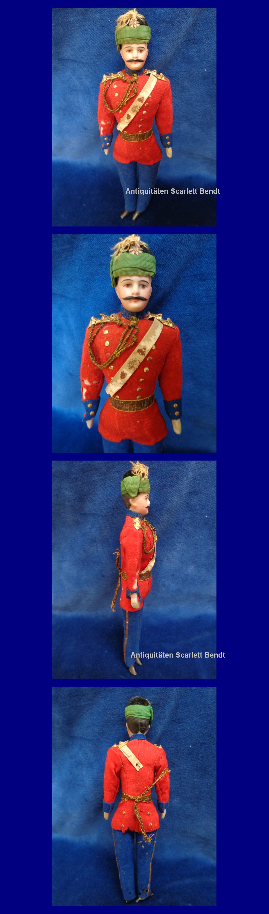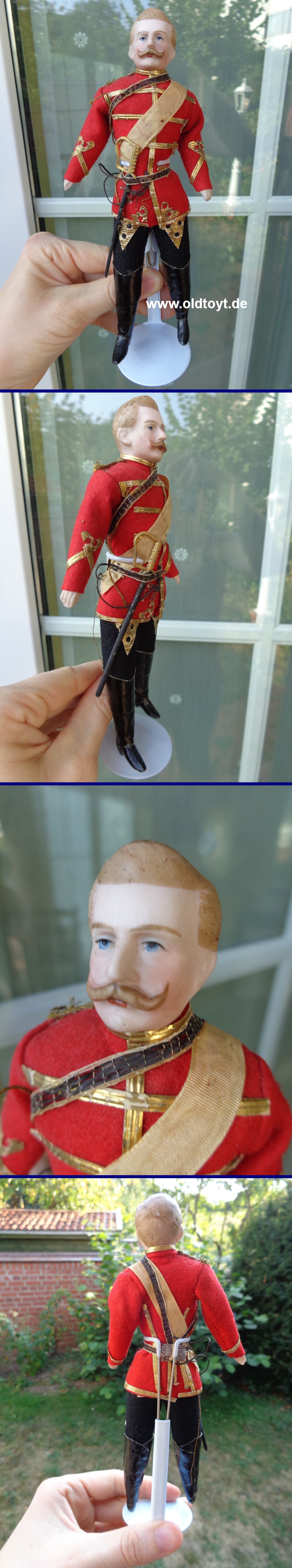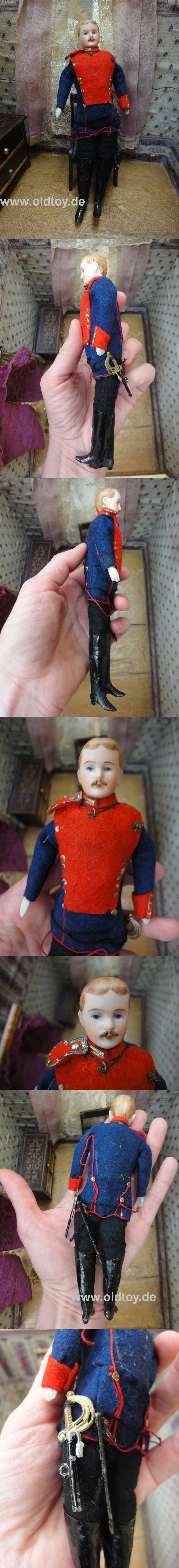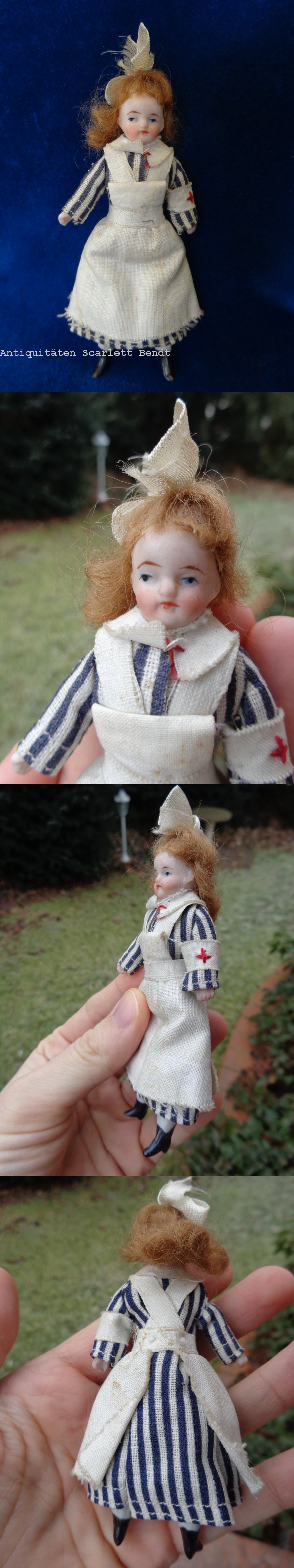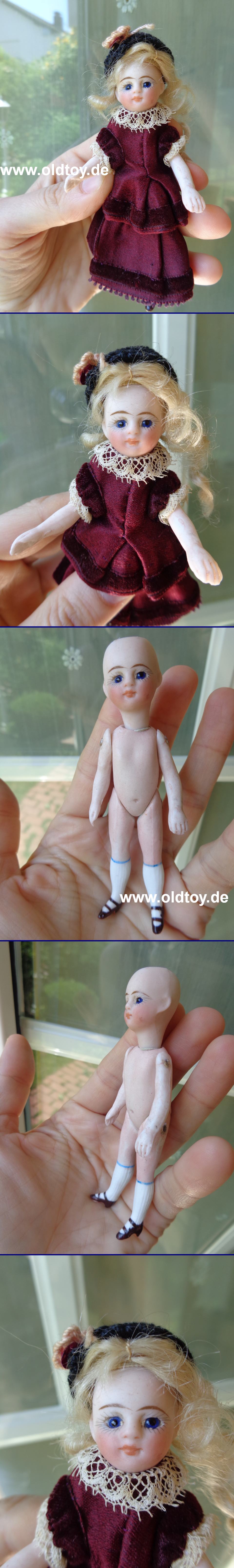 Altersbedingter, guter Zustand, leicht bespielt, mit Altersspuren. Die alte Kleidung ist, wie so oft bei kleinen Puppen, festgenäht. Puppenkopf ohne Haar-Riss, Hände, Beine & Schuhe ohne Abplatzer, ohne geklebte Stellen. Die feine Gesichtsbemalung ist gut erhalten, nicht berieben. Die Schuhe sind aus Biskuitporzellan, die Schuhspitzen und Absätze sind nicht bestoßen, nicht geklebt. Die Hände haben alle Finger, sie sind nicht bestoßen. Die schöne, alte Bekleidung ist in gutem Zustand, mit Altersspuren, ohne Mottenlöcher, mit wenigen kleinen Altersfleckchen. Stubenpuppe ohne Gerüche, aus Nichtraucherhaushalt.