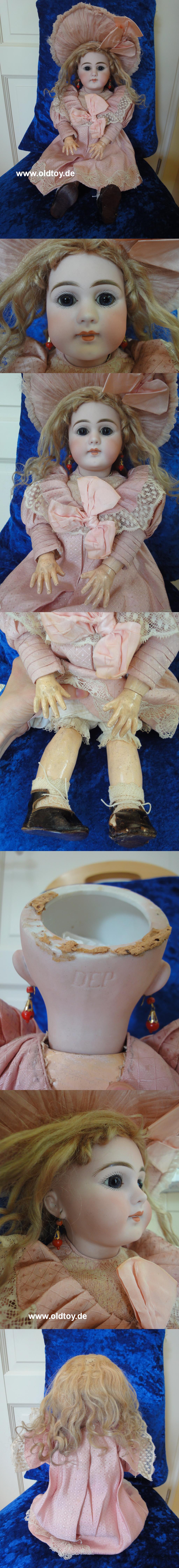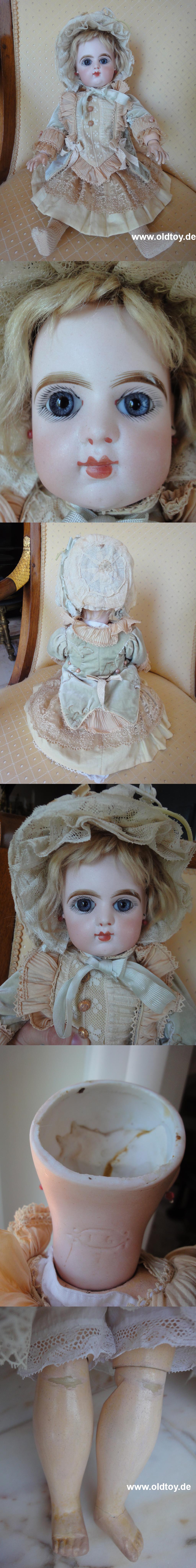 Altersbedingter, sehr guter Zustand mit leichten Spielspuren, schönes helles Porzellan, die Wangen haben keine Kratzer, es gibt keinen Perücken pull. Der Kopf wurde sorgfältig ausgeleuchtet, Kopf garantiert ohne Haar-Riss, ohne Sprünge, ohne chips, ohne restaurierte Stellen. Die grossen blauen Paperweightaugen sind gut erhalten, die Augenausschnitte sind nicht beschädigt. Die antike Mohair-Perücke ist gut erhalten. Die Perücke ist nicht am Kopf festgeklebt, ich kann den Kopf innen mit Watte für den Versand füllen. Der antike Puppenkörper aus Holz und Masse ist schön erhalten, mit altem Finish, es gibt leichte Altersspuren, die Hände sind sehr gut erhalten, sie haben alle Finger. Die Gummis vom Körper sind nicht ausgeleiert, ohne störende Gerüche aus Nichtraucherhaushalt. Das antike Puppenkleid aus Seide und der Hut sind altersüblich recht mitgenommen, mit sichtbarem Stoffverschleiss, Fehlstellen und Löchern, dies sieht man oft bei antiker Seidenkleidung, ich habe alles wie im Fundzustand gelassen.