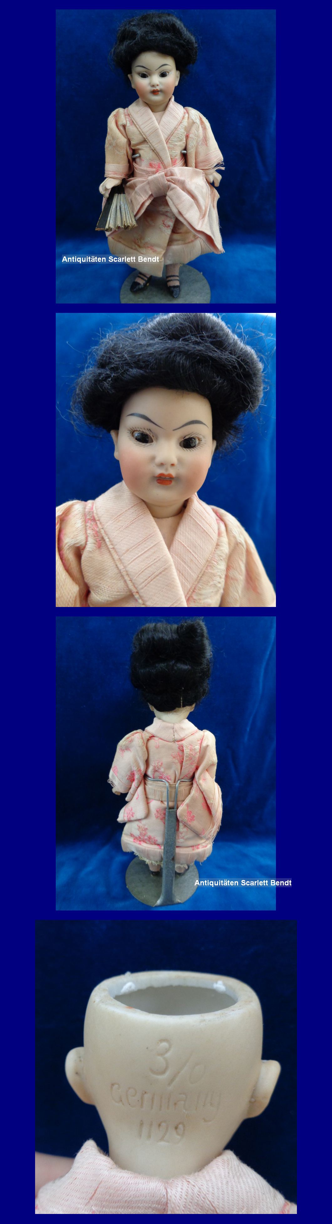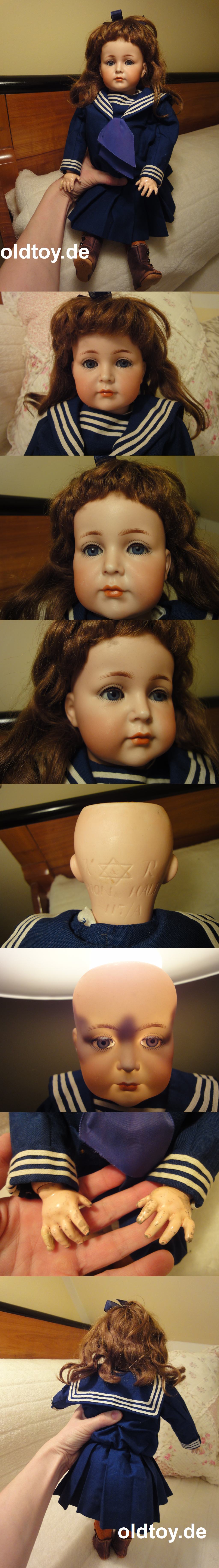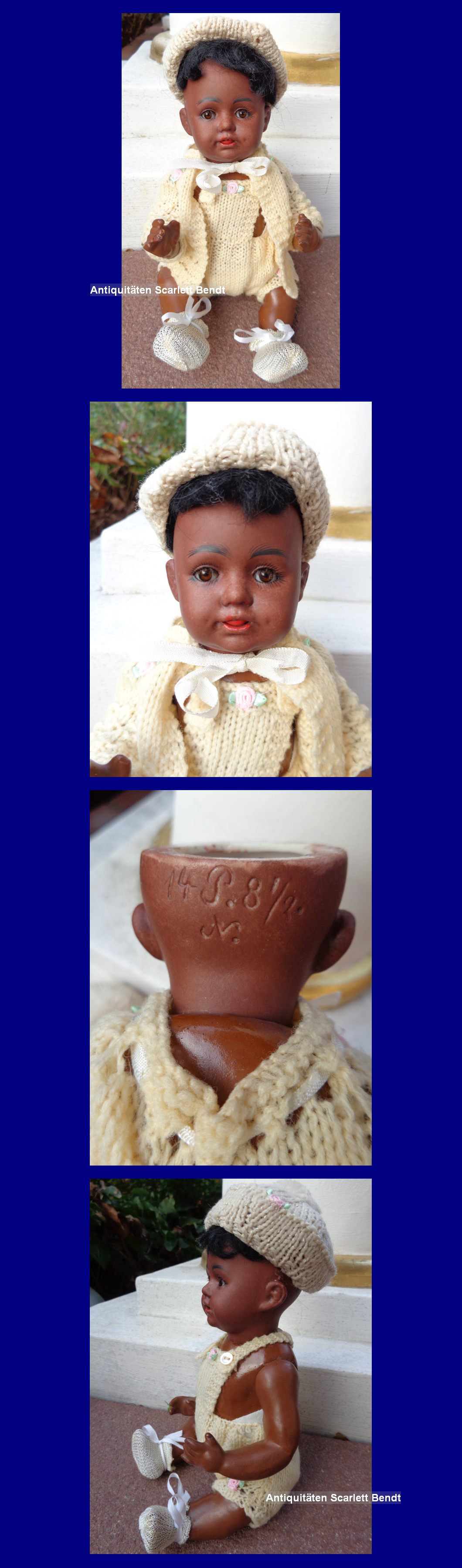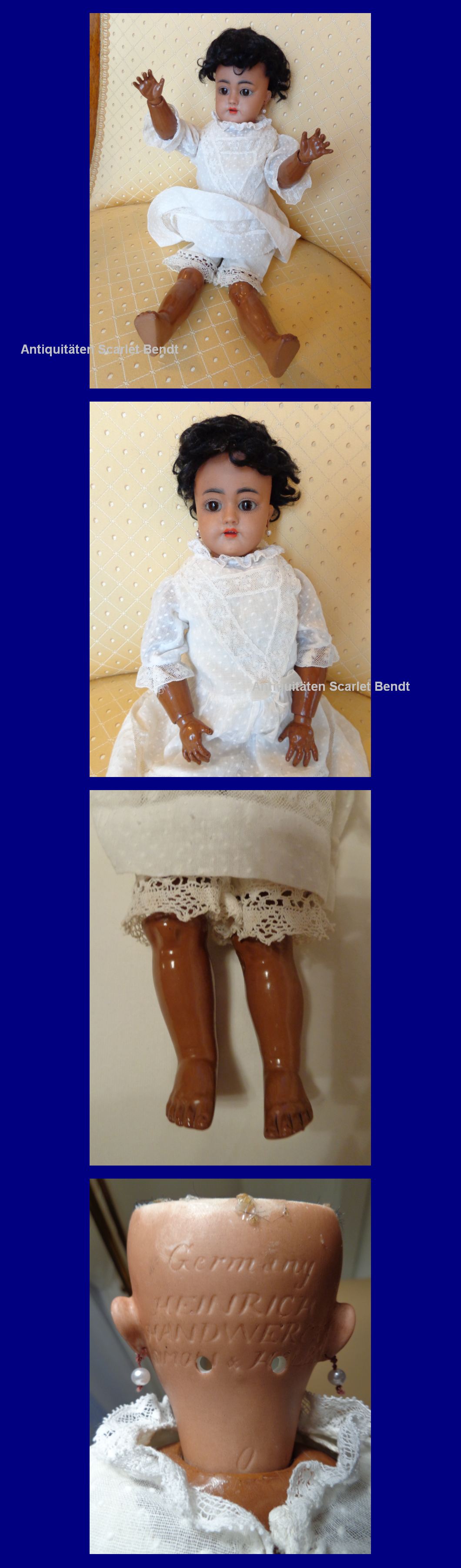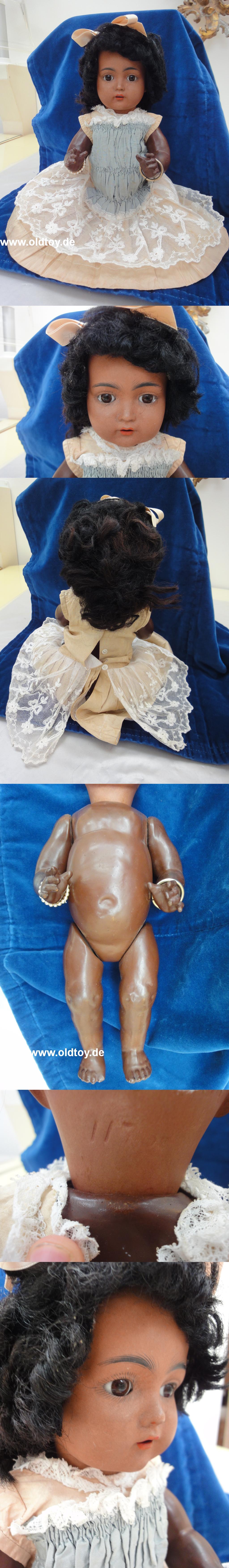 Die Puppe ist in altersbedingtem, guten Zustand mit Spielspuren. Der Kopf wurde ausgeleuchtet, Kopf ohne Haar-Riss, ohne chips, ohne restaurierte Stellen. Sie hat starken perückenpull, das kommt häufig bei den braunen Puppen vor, man sieht es nicht wenn sie ihre schöne Perücke trägt.(Ihre üppige schwarze Locken-Perücke ist alt, ich weiß allerdings nicht ob es die originale Perücke ist). Die Perücke ist nicht am Kopf festgeklebt, ich kann den Kopf für die sichere Reise innen mit Watte füllen. Ihr schönes Gesicht ist stellenweise berieben und hat hier und da feine Kratzerchen. Die kurzen dunkelbraunen Linien im Porzellan sind herstellungsbedingt, entstanden beim Brennen des Porzellans vor über 100 Jahren, keine Risse, dafür garantiere ich. Ihre süßen Füße haben die originalen schwarzen Konturlinien, ihre wunderschönen Hände haben alle Finger. Die Gummis vom Körper wurden fachgerecht von einer Puppendoktorin erneuert, da sie ausgeleiert waren.