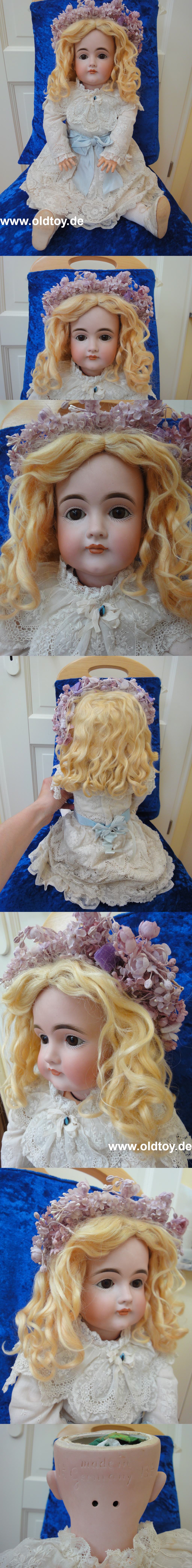 Altersbedingter, sehr guter Zustand mit leichten Spielspuren, bitte siehe Fotos. Der Puppenkopf wurde von innen und aussen gründlich ausgeleuchtet, er ist gut erhalten, ohne Haar-Riss, ohne Sprünge, ohne chips, ohne restaurierte Stellen. Das Gesicht ist traumhaft schön modelliert, Wangen ohne Kratzer, es gibt wenige alte Klebespuren von der Perücke. Die Augen schliessen wenn man die Puppe auf den Rücken legt. Die antike Perücke ist gut erhalten, sie ist nicht am Kopf festgeklebt, ich kann den Kopf innen mit Watte füllen. Der antike Puppenkörper ist gut erhalten, schönes, altes finish, die Gummis sind nicht ausgeleiert, die Hände haben alle Finger. Die schöne Puppenkleidung ist gut erhalten mit kleinen Altersspuren. Ganz sicher originale, antike Puppe um 1912, keine Replik, nichts nachgemachtes, dafür garantiere ich.