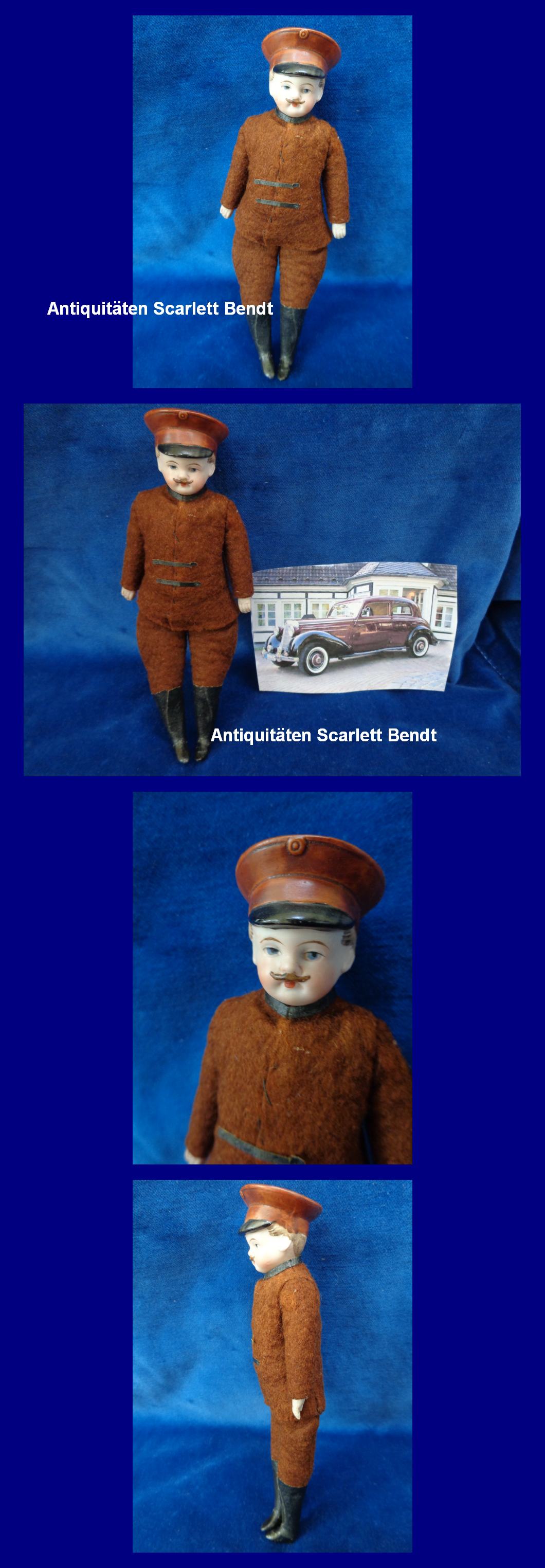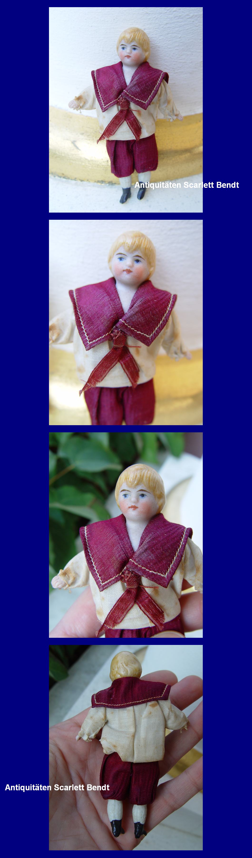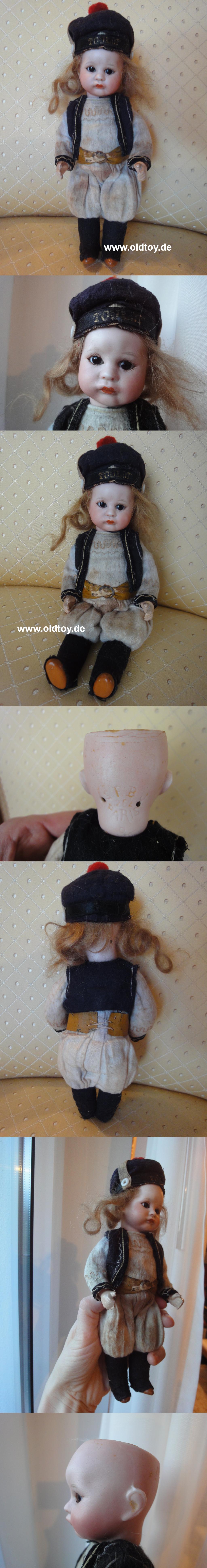 Altersbedingter, guter Zustand mit leichten Spielspuren, sein Köpfchen wurde behutsam ausgeleuchtet, Kopf ohne Haar-Riss, ohne Abplatzer, es gibt lediglich eine kurze, herstellungsbedingte Brandlinie (circa 0,5 mm) von der Kopfkrone ausgehend, kaum wahrnehmbar, absolut nicht störend. Ich habe auch den Halsbereich geprüft, alles in Ordnung. Der süße Bub ist komplett original bekleidet, mit schönem antiken Marine-Hütchen. Die antike Kleidung ist gut erhalten mit Altersspuren. Originale, antike Perücke, diese ist nicht am Köpfchen festgeklebt. Die Puppe kann sitzen und stehen. Die Hände haben alle Finger. Aus Nichtraucherhaushalt. Garantiert antike Puppe, keine Replik.