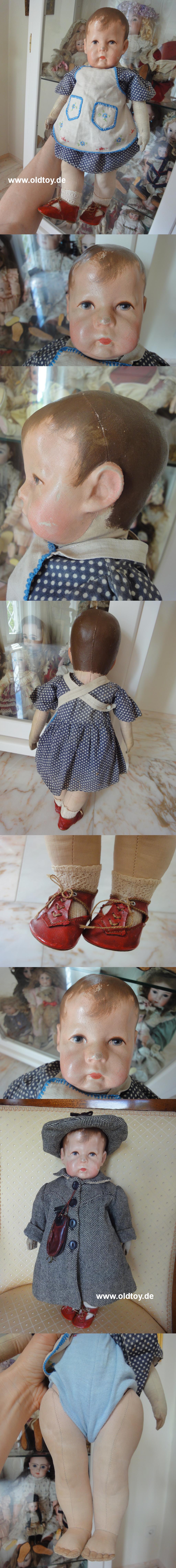 Altersbedingter, guter, stellenweise leicht bespielter Zustand. Der Kopf wurde ausgeleuchtet, Kopf ohne Haar-Riss, ohne Sprünge, ohne restaurierte Stellen. Die feine Gesichtsbemalung ist gut erhalten, an wenigen Stellen leicht berieben. Die Mundbemalung ist altersüblich berieben, das sieht man häufig bei den braun getönten Puppenköpfen. Die braunen Glasaugen sind unbeschädigt, sie sind nicht festgesetzt. Die antike Mohairperücke ist für das hohe Alter sehr gut erhalten, ohne Gerüche. Die Perücke ist nicht am Kopf festgeklebt, ich kann den Puppenkopf für einen sicheren Versand innen ausstopfen. Der antike Babykörper ist sehr gut erhalten, mit originalem Finish, stellenweise leicht berieben. Keine Abplatzer am Halsrand, der Körper wurde nicht übermalt. Es fehlen keine Finger, die Finger sind nicht bestossen, lediglich die Ringfingerkuppe der rechten Babyhand ist minimal gechipt. Es gibt keine geklebten/restaurierten Finger, die Babyfüße haben alle Zehen. Sogar die schwarzen Konturlinien sind noch vorhanden. Die Körperbespannung ist gut. Die reizvolle Puppenkleidung ist gut erhalten, mit kleineren Gebrauchsspuren, unter der Strickkleidung trägt das Baby eine recht einfache Windel aus weißem Stoff. Puppenkleidung ohne Gerüche, aus Nichtraucherhaushalt.