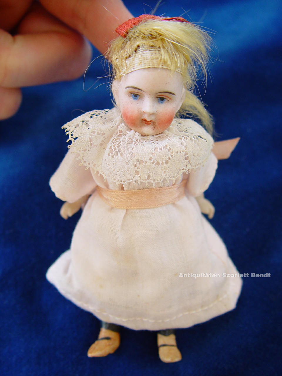 Guter, leicht bespielter Zustand, mit Alters- und Gebrauchsspuren. Ich kann keine restaurierten oder geklebten Stellen erkennen. Die blonde Perücke ist, wie so oft bei den kleinen Puppen, am Kopf festgeklebt, sie weist Gebrauchsspuren auf. Der Daumen ihrer rechten Hand ist minimal bestossen. Puppenfüße ohne Bestoßungen. Antike Puppenkleidung mit leichten Altersspuren.