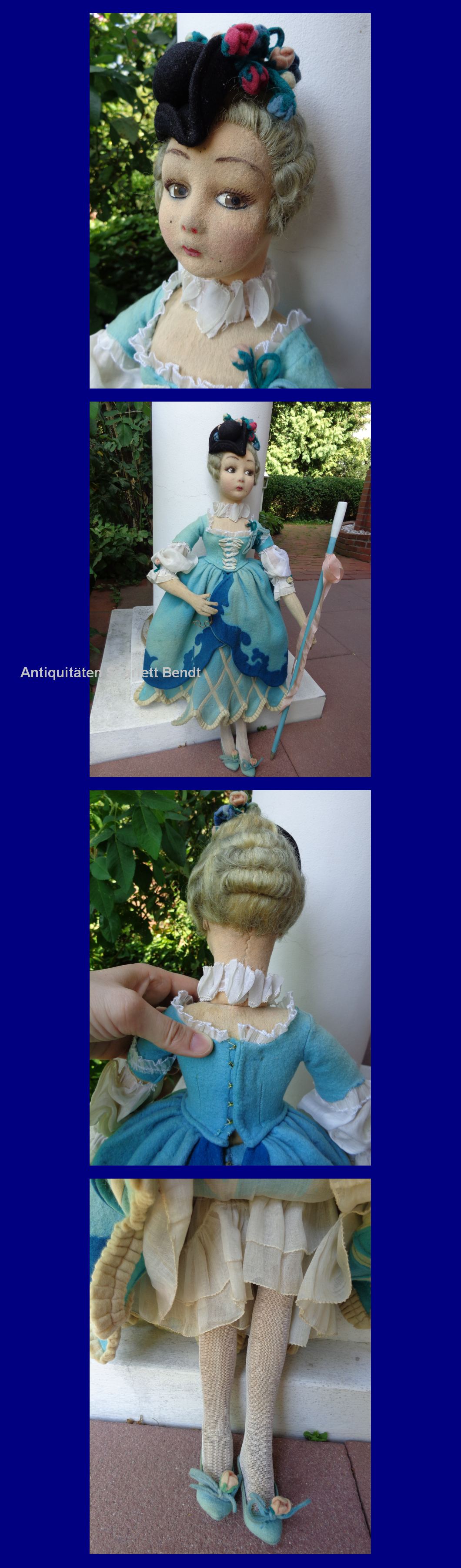 Altersbedingter, exzellenter Zustand, mit leichten Alters- und Gebrauchsspuren, bitte siehe Fotos. Der Puppenkopf wurde ausgeleuchtet, Kopf ohne Haar-Riss, ohne restaurierte Stellen. Lediglich leichter Perückenpull und zwei winzige (wenige Milimeter lange) Brandrisschen am Kopfkronenrand, diese sind herstellungsbedingt und daher nicht wertmindernd. Die antike Locken-Perücke ist gut erhalten mit leichten Altersspuren, sie ist nicht am Kopf festgeklebt, der Puppenkopf kann für den sicheren Versand ausgestopft werden. Der antike Puppenkörper ist gut erhalten, mit Altersspuren, es fehlen keine Finger. Die Gummis sind gut. Die Puppenkleidung ist gut erhalten, mit Altersspuren (stellenweise Flecken), ohne Gerüche, aus Nichtraucherhaushalt.